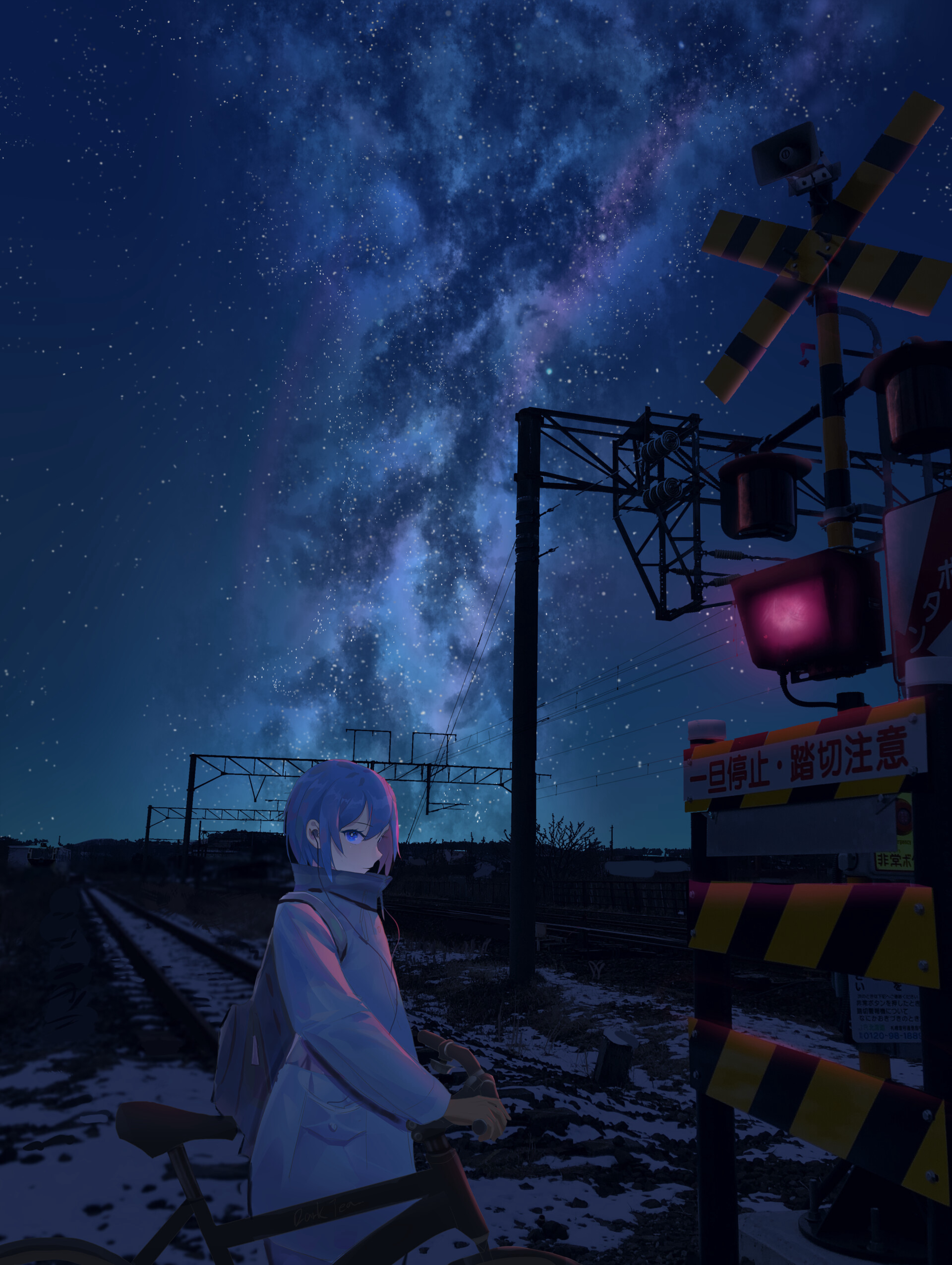 Wallpaper girl, bicycle, night, stars, rails, railway