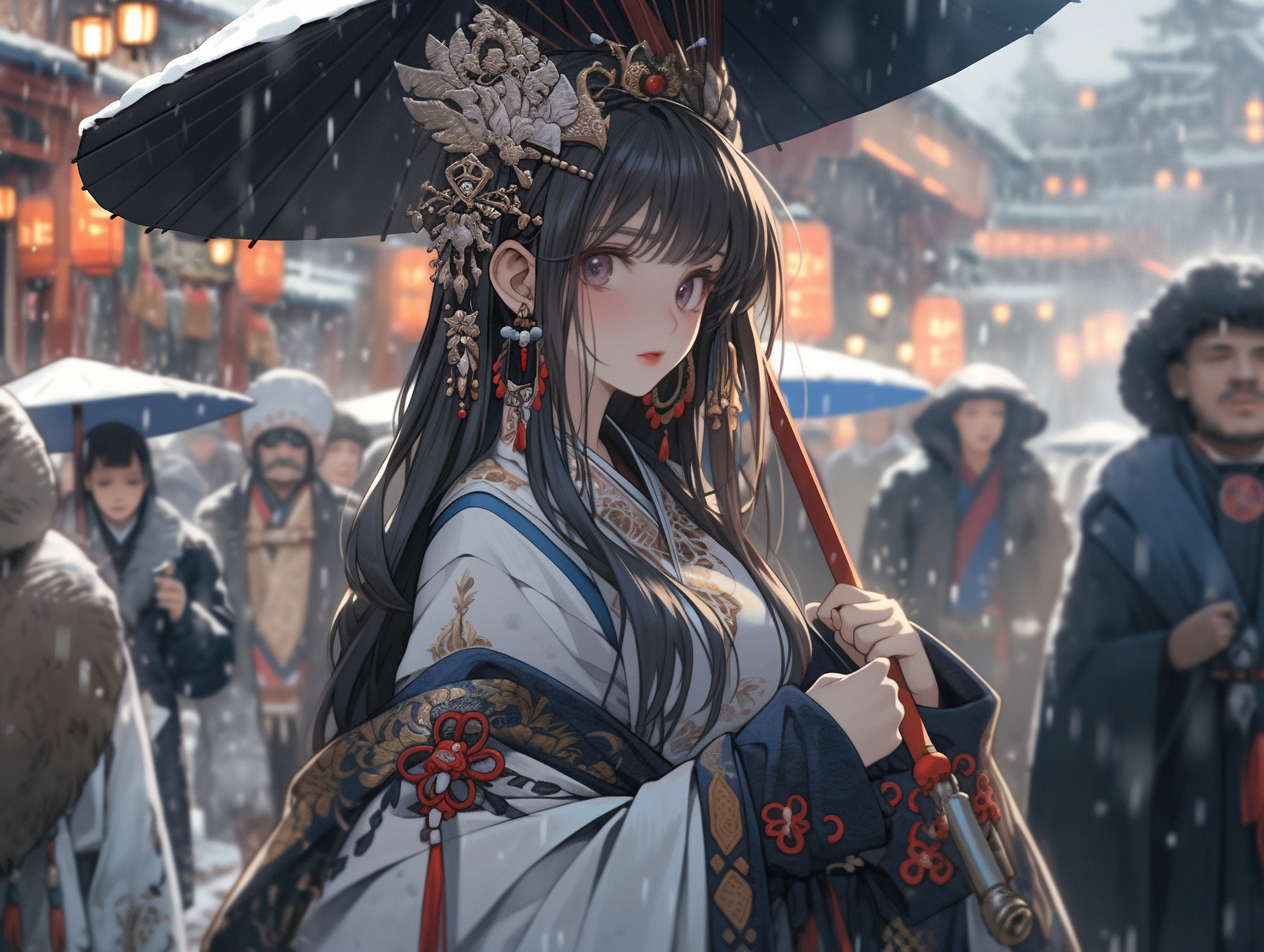 Wallpaper girl, jewelry, umbrella, kimono, anime, snow
